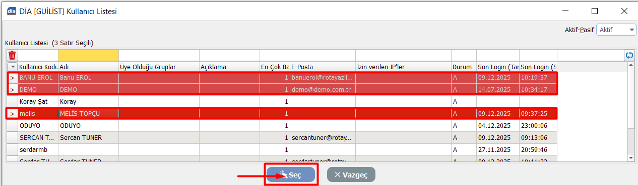 Birden fazla kullanıcıya aynı anda işlem yapmak istiyorsanız şu adımları takip edin: