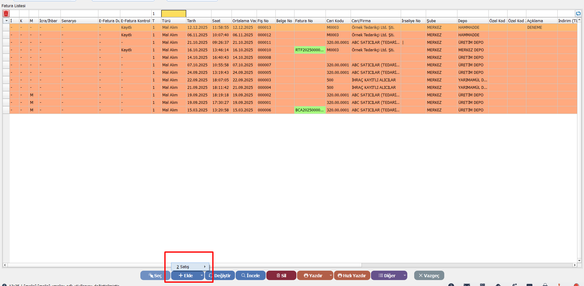Kısıtlama: Yeni bir alım faturası oluşturamaz. “Ekle” butonu pasif (tıklanamaz) durumda olur.
