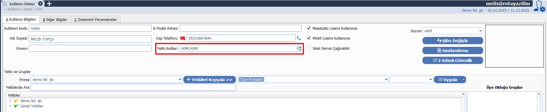 📌 Bu yöntem, özellikle tek bir yetki kodu tanımını birden fazla kullanıcıya vermek istediğinizde idealdir.