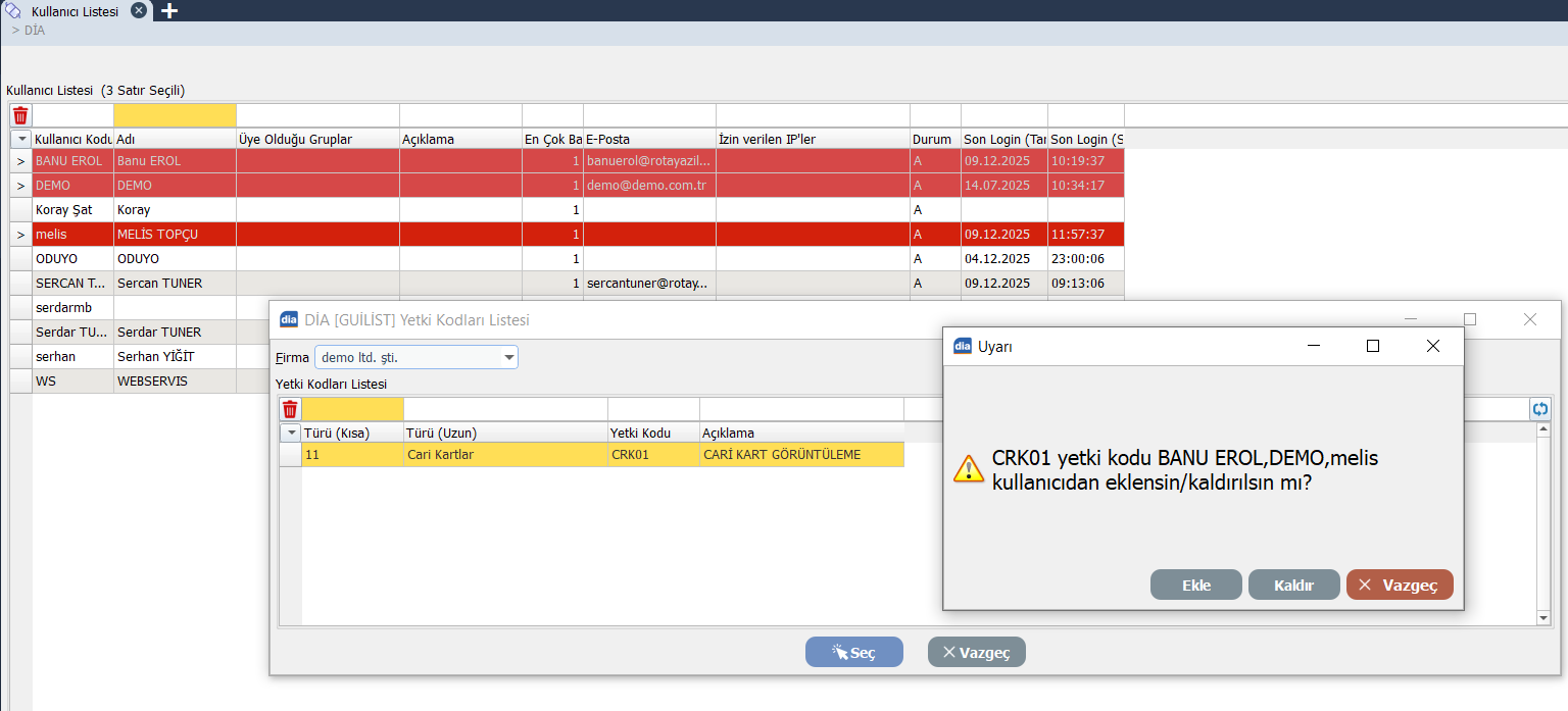 Sistem size şu soruyu soracaktır: “Eklensin mi, kaldırılsın mı?” Bu işlem sayesinde, seçilen yetki kodu tüm kullanıcılara ekleyebilir ya da tam tersi olarak tüm kullanıcılardan kaldırabilirsiniz.