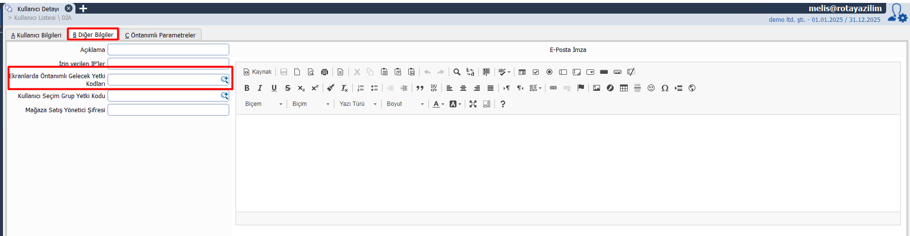 Bunun yanı sıra, kullanıcı detay ekranında “Diğer Bilgiler” sekmesine giderek ön tanımlı kod belirleyebilirsiniz. Buradan seçtiğiniz yetki kodu; Fatura, Sipariş veya Fiş gibi ekranlarda otomatik olarak gelir.