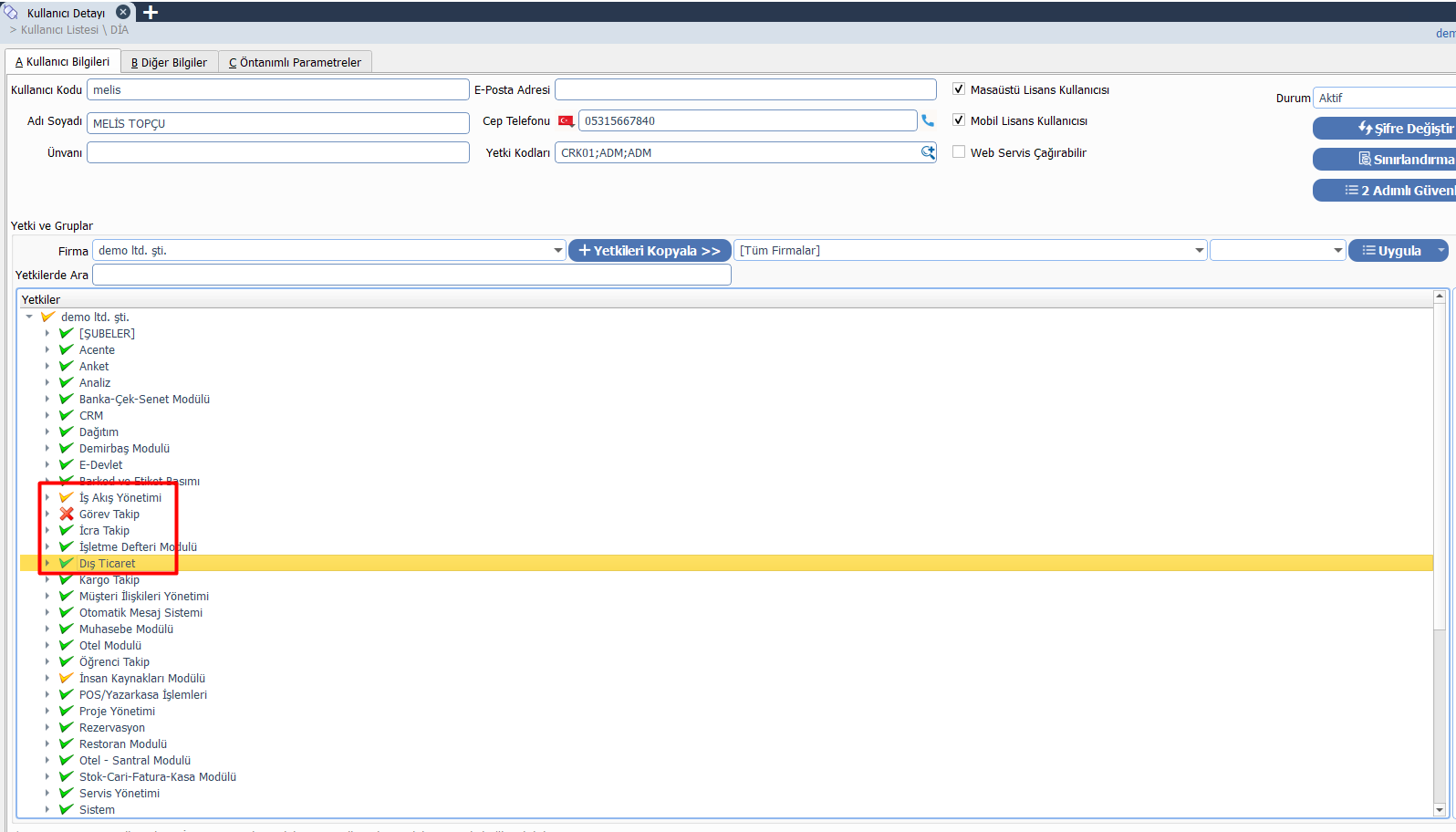 Yetki kodları kayıt bazlıdır; bununla birlikte kullanıcıların hangi modüllerde işlem yapabileceğini kullanıcı kartından tanımlayabilirsiniz.